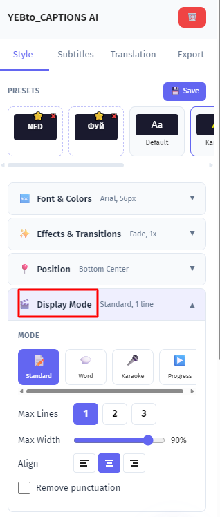 Display mode — choose how subtitles appear on screen. Standard shows the full segment at once. Word-by-word reveals one word at a time, TikTok-style. Word highlight is karaoke mode — the full sentence is visible but each word lights up as it's spoken. Line progress draws a progress bar across the text in sync with the audio. Word-by-word and karaoke modes work best for short-form content where you want maximum visual engagement.