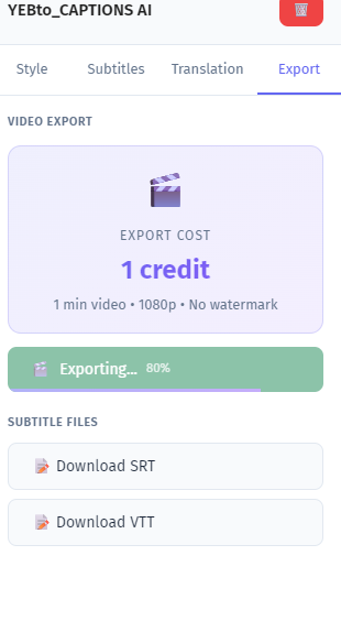 Go to captions.yeb.to and sign in with your Google account. It takes one click. New users get free credits to test the tool before buying anything. With free credits you can transcribe and export videos up to 1 minute long — enough to test everything and see the quality. The only catch is a small YEB.to watermark on the exported video. SRT and VTT subtitle files are always free with no watermark, regardless of plan.
