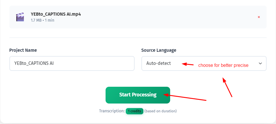 When everything looks right, hit "Start Processing." The AI will begin transcribing your content. This usually takes a fraction of the actual video length — a 10-minute video transcribes in about a minute.